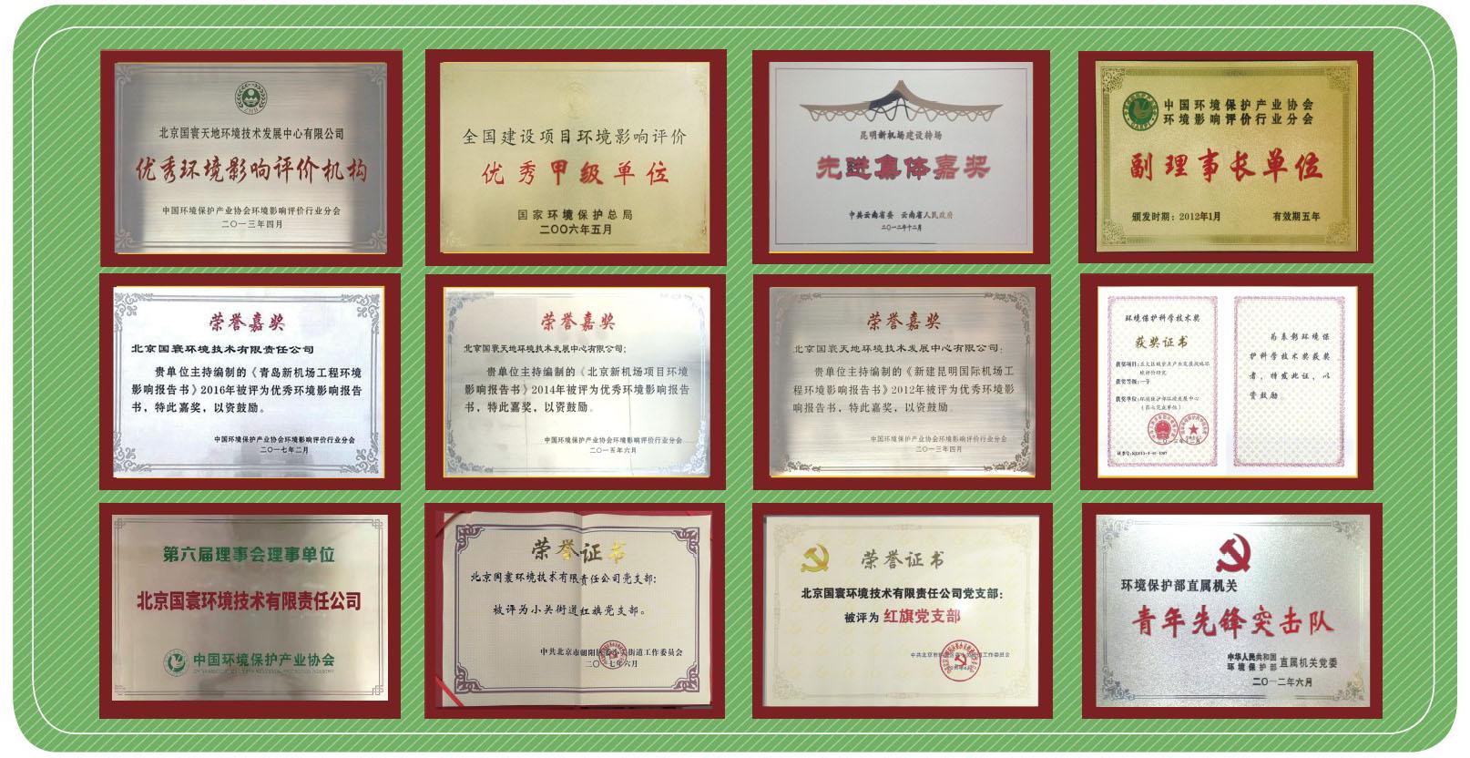 2022年度 中國(guó)環(huán)境保護(hù)產(chǎn)業(yè)協(xié)會(huì)頒發(fā)《中國(guó)環(huán)境保護(hù)產(chǎn)業(yè)協(xié)會(huì)理事單位》 2019年度 中國(guó)環(huán)境保護(hù)產(chǎn)業(yè)協(xié)會(huì)頒發(fā)《中國(guó)環(huán)境保護(hù)產(chǎn)業(yè)協(xié)會(huì)常務(wù)理事單位》 2017年度 中國(guó)環(huán)境保護(hù)產(chǎn)業(yè)協(xié)會(huì)環(huán)境影響評(píng)價(jià)行業(yè)分會(huì)頒發(fā)《青島新機(jī)場(chǎng)工程環(huán)境影響報(bào)告書(shū)》優(yōu)秀環(huán)境影響報(bào)告書(shū) 2015年度 中國(guó)環(huán)境保護(hù)產(chǎn)業(yè)協(xié)會(huì)環(huán)境影響評(píng)價(jià)行業(yè)分會(huì)頒發(fā)《北京新機(jī)場(chǎng)項(xiàng)目環(huán)境影響報(bào)告書(shū)》優(yōu)秀環(huán)境影響報(bào)告書(shū) 2013年度 中國(guó)環(huán)境保護(hù)產(chǎn)業(yè)協(xié)會(huì)環(huán)境影響評(píng)價(jià)行業(yè)分會(huì)頒發(fā)《新建昆明國(guó)際機(jī)場(chǎng)工程環(huán)境影響報(bào)告書(shū)》優(yōu)秀環(huán)境影響報(bào)告書(shū) 2013年度 中國(guó)環(huán)境保護(hù)產(chǎn)業(yè)協(xié)會(huì)環(huán)境影響評(píng)價(jià)行業(yè)分會(huì)頒發(fā)《優(yōu)秀環(huán)境影響評(píng)價(jià)機(jī)構(gòu)》 2013年度 中華人民共和國(guó)環(huán)境保護(hù)部國(guó)家環(huán)境保護(hù)科學(xué)技術(shù)獎(jiǎng)獎(jiǎng)勵(lì)委員會(huì)頒發(fā)《五大區(qū)域重點(diǎn)產(chǎn)業(yè)發(fā)展戰(zhàn)略環(huán)境評(píng)價(jià)研究》一等獎(jiǎng) 2012年度 中國(guó)環(huán)境保護(hù)產(chǎn)業(yè)協(xié)會(huì)環(huán)境影響評(píng)價(jià)行業(yè)分會(huì)頒發(fā)《副理事長(zhǎng)單位》 2012年度 中共云南省委云南省人民政府頒發(fā)《先進(jìn)集體嘉獎(jiǎng)》 2012年度 中華人民共和國(guó)環(huán)境保護(hù)部直屬機(jī)關(guān)黨頒發(fā)《青年先鋒突擊隊(duì)》 2006年度 國(guó)家環(huán)境保護(hù)總局頒發(fā)《全國(guó)建設(shè)項(xiàng)目環(huán)境影響評(píng)價(jià)優(yōu)秀甲級(jí)單位》 2020年度 中共北京市朝陽(yáng)區(qū)委小關(guān)街道工作委員會(huì)頒發(fā)《小關(guān)街道紅旗黨支部》 2019年度 中共北京市朝陽(yáng)區(qū)委小關(guān)街道工作委員會(huì)頒發(fā)《小關(guān)街道紅旗黨支部》 2018年度 中共北京市朝陽(yáng)區(qū)委小關(guān)街道工作委員會(huì)頒發(fā)《小關(guān)街道紅 旗黨支部》 2017年度 中共北京市朝陽(yáng)區(qū)委小關(guān)街道工作委員會(huì)頒發(fā)《小關(guān)街道紅旗黨支部》